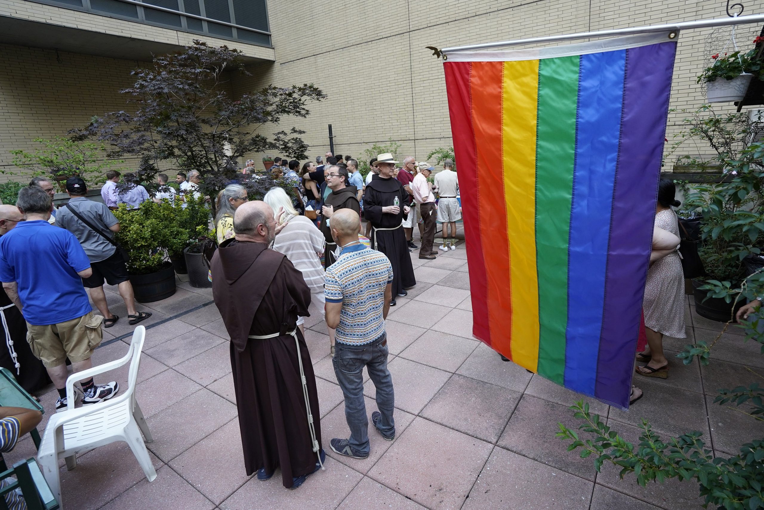 На фото: Францисканские монахи церкви Святого Франциска Ассизского в Нью-Йорке и члены ЛГБТ+ служения прихода собираются на приеме после ежегодной «Праздничной мессы перед прайдом» 26 июня 2021 года. (Фото CNS/Грегори А. Шемитц)
